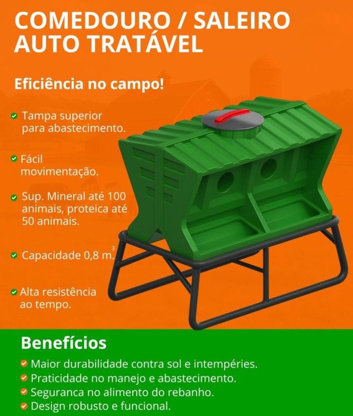 Garanta mais produtividade, praticidade e proteção na alimentação do seu rebanho com o Comedouro/Saleiro Auto Tratável, desenvolvido para oferecer o melhor desempenho mesmo nas condições mais exigentes do campo.