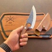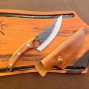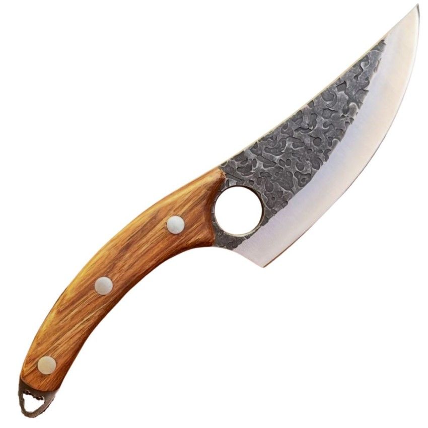 O cabo em madeira natural oferece firmeza, conforto e um toque rústico, remetendo à vida campeira. A faca acompanha bainha em courino, garantindo praticidade e segurança no transporte.