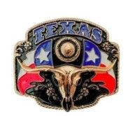 Fivela country autêntica em metal alto‑relevo com caveira de boi, acabamento esmaltado nas cores da bandeira do Texas e medalhão central com selo do estado do Texas. Unissex, robusta e ideal para cintos estilo country/sertanejo. Produto da Selaria Cardoso e Coimbra, com tradição de gerações no setor.
