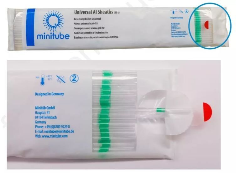Bainhas universais descartáveis e esterilizadas para inseminação artificial bovina, compatíveis com palhetas de 0,25 e 0,50 mm, garantindo aplicação precisa, segura e confortável.