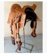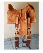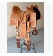 Fabricado totalmente em couro legítimo, cuidadosamente selecionado e tratado, este arreio garante durabilidade e resistência excepcionais. Sua estrutura é composta por armação de madeira com estrutura de ferro, revestida com couro cru, proporcionando robustez e estabilidade durante o uso.