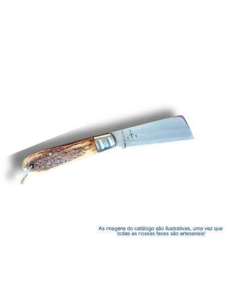 Este canivete é uma peça de arte e utilidade. Sua lâmina é forjada em aço inox 440C, conhecido por sua alta resistência e retenção de fio. O cabo, confeccionado em chifre de cervo natural, oferece grip confortável e visual exclusivo.