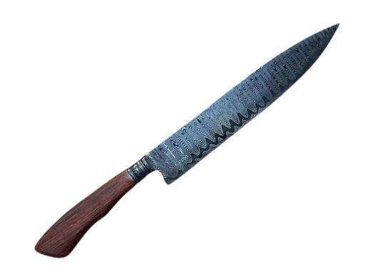 Faca feita em aço Damasco Padrão Ladder com 11" de lâmina, com colarinho esculpido e cabo em madeira estabilizada.