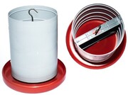 Com estrutura robusta, ele é ideal para uso em granjas, podendo ser posicionado diretamente no piso ou suspenso, conforme a necessidade do manejo. Seu design com prato vermelho e corpo cinza facilita a identificação e o controle da alimentação.
