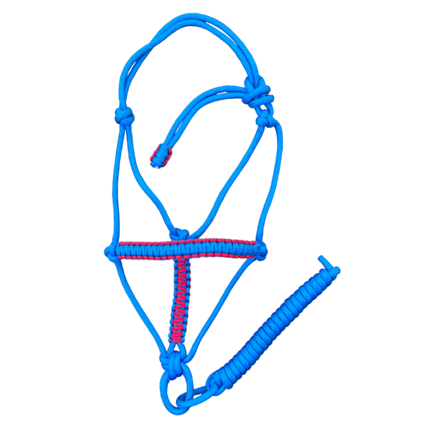 Cabresto de 7 nós feito em corda de polipropileno 8 mm, resistente e ajustável, com cabo de aproximadamente 2,6 m e detalhes trançados disponíveis em diversas cores.