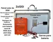 Alimentação: Módulo (painel) solar 35 W (acompanha) e Bateria 12 Vdc (não acompanha – utilize bateria nova, de preferência estacionária);